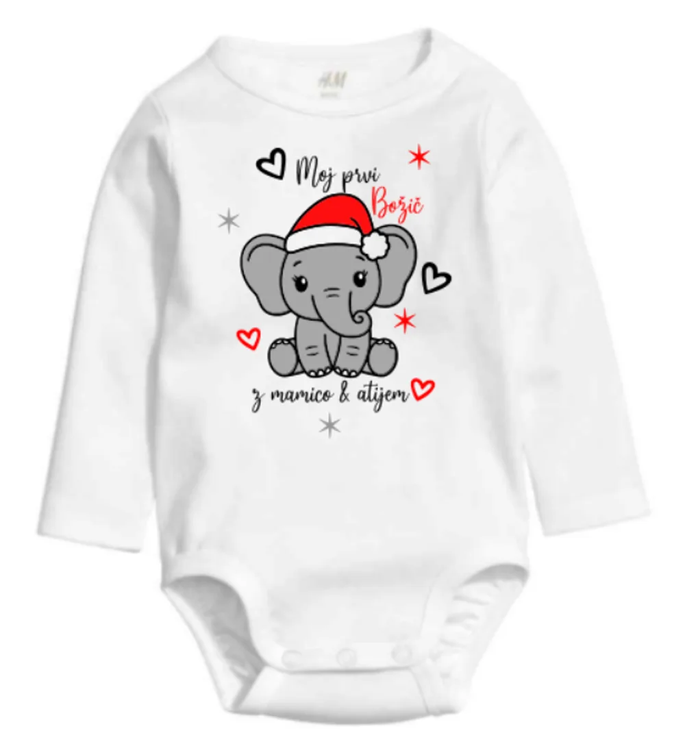 Božični bodi s potiskom slončka z božično kapo.