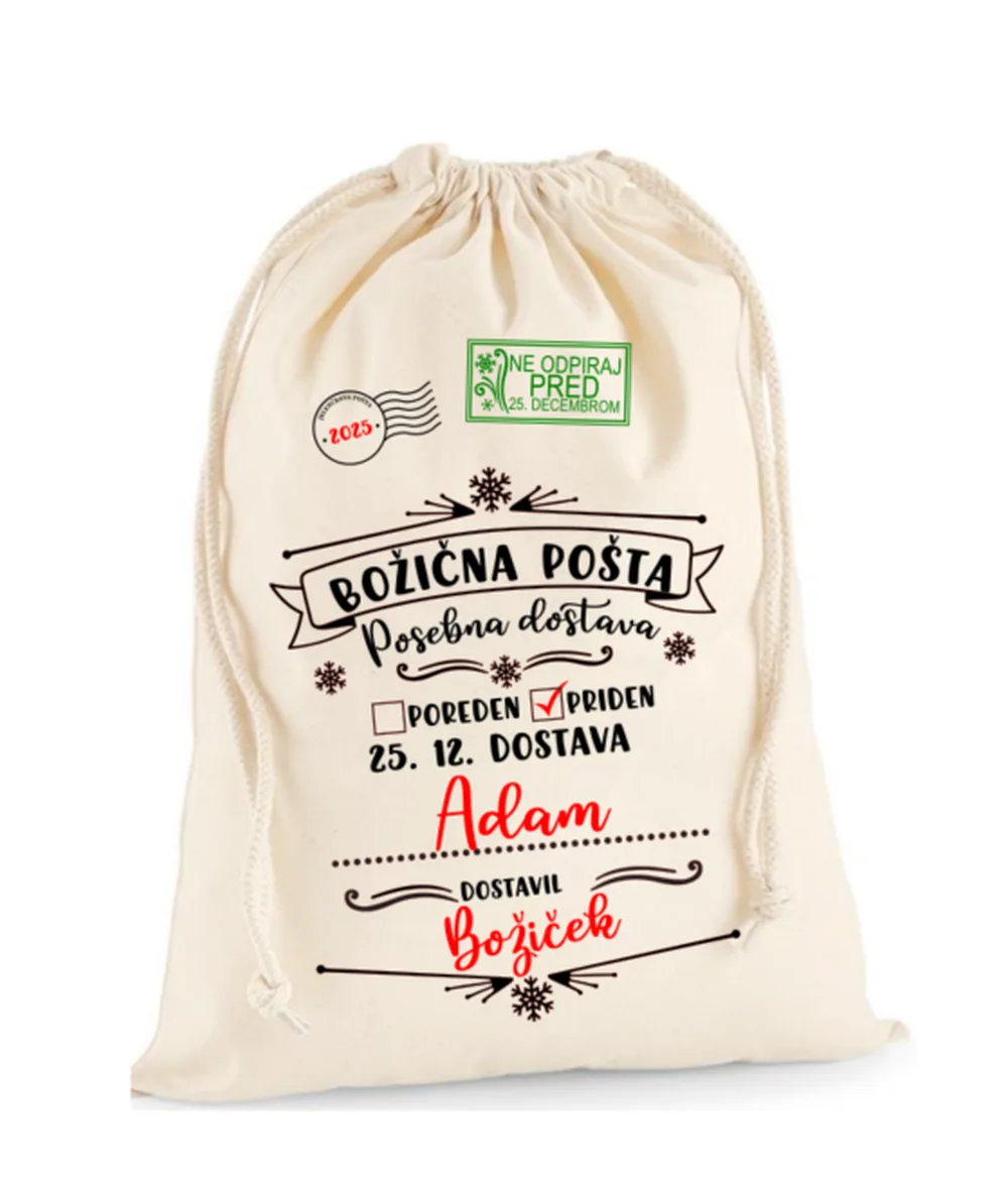 Izdelana je iz kakovostnega, trpežnega blaga (bombaž), ki jo lahko uporabljate več let zapored. Vreča je opremljena z vrvico za zavezovanje, tako da darila ostanejo skrita do pravega trenutka.